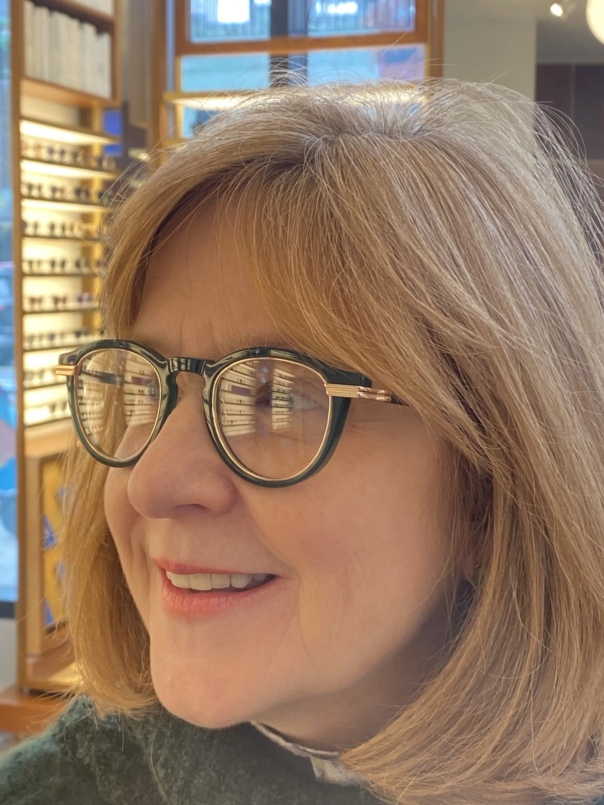 A woman with reddish-blonde hair wearing glasses with green and gold frames inside a store with display shelves.